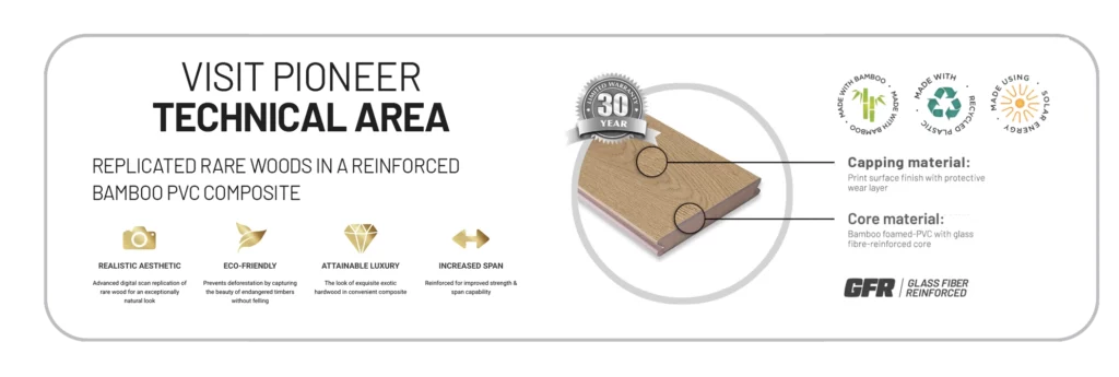 Pioneer composite captures the richness of authentic regional and exotic woods using scans of the real timber, delivering a finish so convincing that even seasoned contractors and industry experts, need a closer look. The timber detail is extraordinary, offering an indistinguishable look of hardwood, but in a long lasting, low maintenance composite material.
